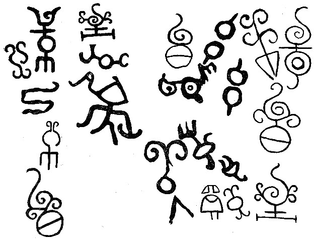 Первоначально я вслед за установившейся традицией считала, что древнейшие дошедшие до нас тамги Монголии относятся к древнетюркскому времени. Однако после выделения из их массы аналогов тем тамгам, что встречаются на древнетюркских каменных изваяниях, стелах с руническими текстами и каменных (116/117) черепахах — постаментах этих стел, удалось обнаружить большую группу резко отличающихся от них знаков. Часть из них оказалась сходной с рисунками на оленных камнях и потому была датирована нами концом II — началом I тысячелетия до н.э. В то же время целая группа тамг, самых живописных и витиеватых, долгое время не находила себе аналогов и потому объяснения.