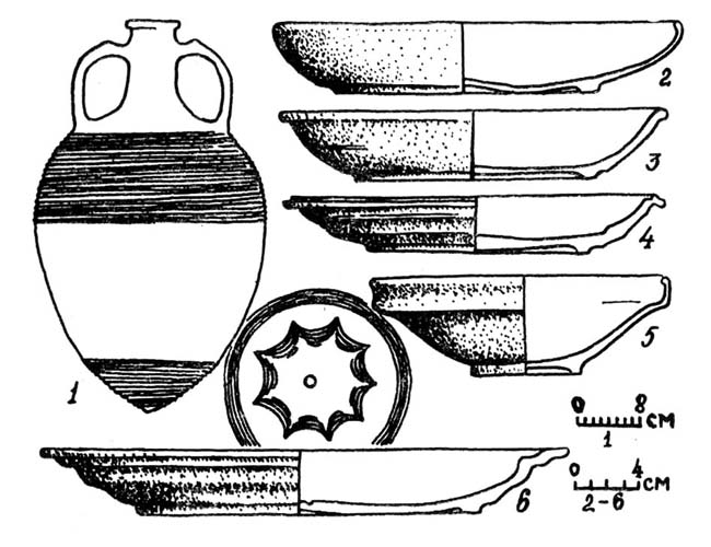 Рис. 24. Импортные глиняные изделия — амфора (1) и краснолаковые тарелки (2-6): 1 — Цибилиум, 2, 3, 5, 6 — Шапка, 4 — Ажара.