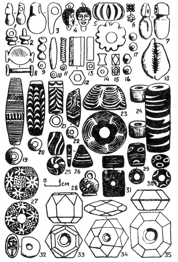 Рис. 25. Импортные (1-32) и местные (33-35) бусы из различных могильников Цебельды: 1-4 — медовое стекло, 5-6 — «египетский» фаянс, 7 — янтарь, 8, 9 — стекло с металлической прокладкой, 10-16 — синее стекло, 17 — сердолик, 18 — раковина каури, 19-30 — паста, 31 — гешир, 32 — камень, 33-35 — горный хрусталь. [83]