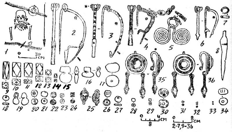 Рис. 26. План (1) и инвентарь погребения со стеклянной подвеской в виде головки негритянки: 2-4, 6 — бронзовые фибулы, 5 — бронзовая подвеска, 7 — бронзовое кольцо, 8 — железный нож, 9-14, 18, 19, 27-29, 31-33 — стеклянные бусы, 15-17 — янтарные бусы, 35-36 — серебряные подвески с сердоликами.