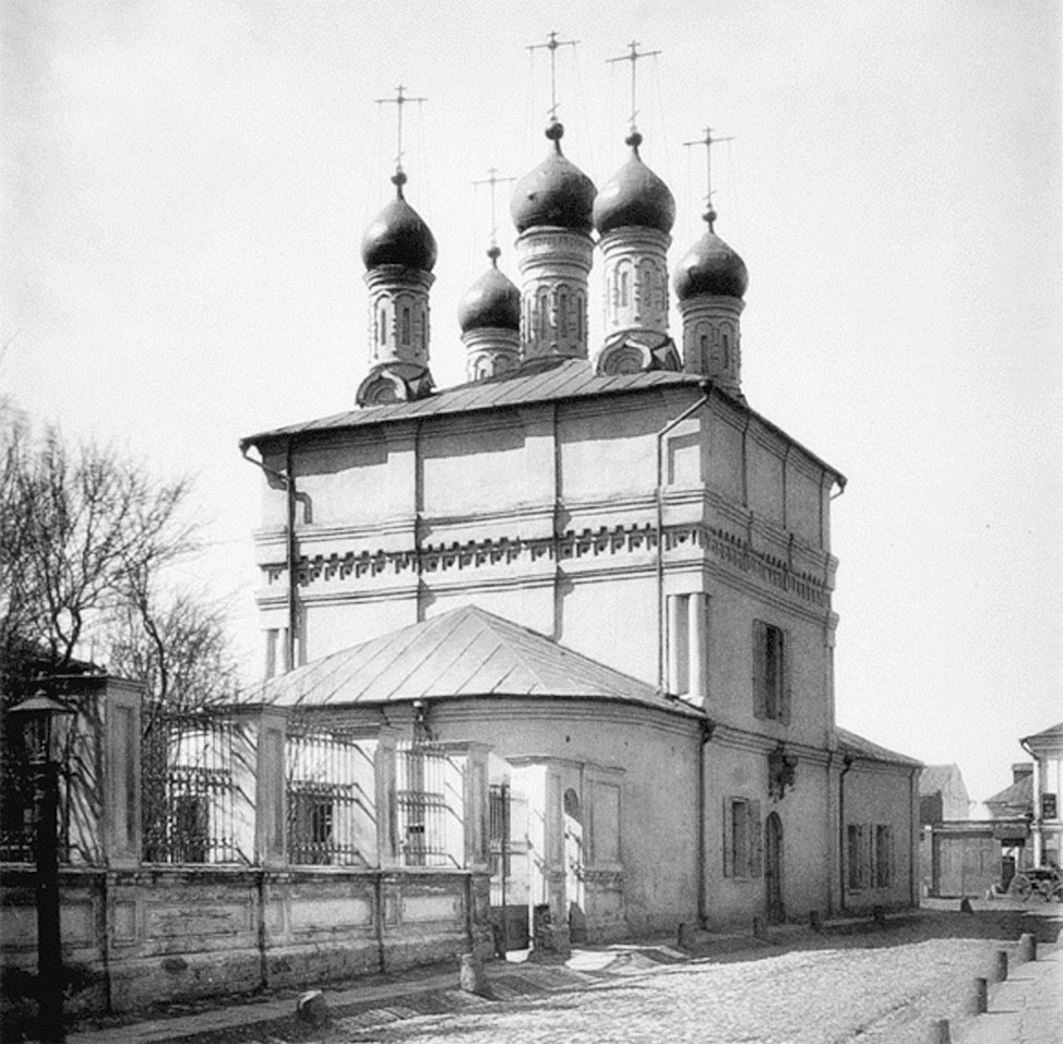 До 1677 года церковь имела название Сретения мощей великого князя Черниговского Михаила. Первый каменный храм был возведен в 1675 году на пожертвования купеческой вдовы Иулиании Ивановны Малютиной. Эта характерная посадская церковь конца XVII века сохранилась до наших дней. Она состояла из трапезной и небольшого четверика с кокошниками, завершенного пятиглавием. С запада осевую композицию замыкала колокольня. В 1740 году к храму с южной стороны был пристроен придел Святой Великомученицы Екатерины. Тогда же появился новый декор на фасадах притвора и трапезной, а крыша с кокошниками стала четырехскатной. В 1820–1830-х годах церковь была упразднена и считалась приписанной к храму Усекновения главы Иоан на Предтечи под Бором. Придел Святой Екатерины и верхняя часть колокольни были разобраны.