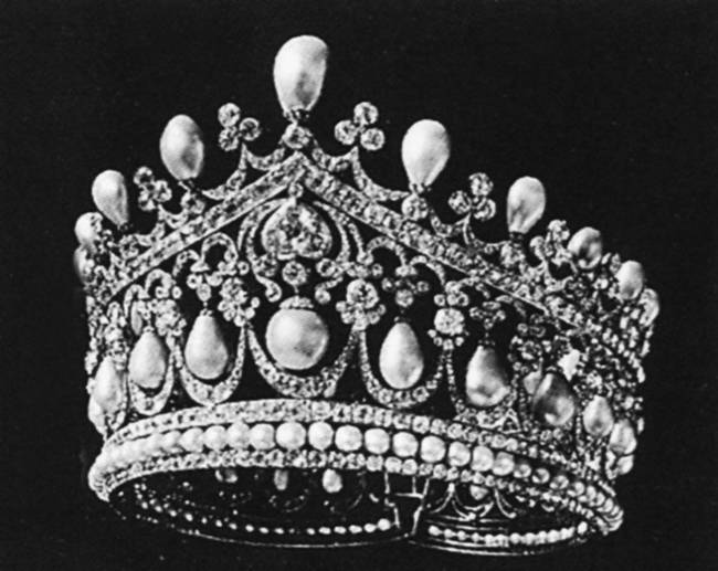 Переделанная диадема получилась на славу. Хотя её завершение и сохранило форму треугольника, присущую началу XIX века, но триады крупных бразильских бриллиантов, чередующиеся с аккуратно закреплёнными на невидимых штырьках жемчужными грушками, невольно напоминали о модных элементах, заимствованных в искусстве готики. О временах Средневековья заставляли вспомнить и конструкции двойных арочек, с которых изящно свешивались подвижно закреплённые перлы изумительной красоты и величины, причём каждый тяжело покачивался над алмазным фестоном, похожим то ли на подкову, то ли на полумесяц. Сам же ободок формировали два бриллиантовых пояска с заключённой между ними вереницей почти идеально круглых «горошинок»-жемчужин, постепенно уменьшающихся от центра к краю.[369] Недаром дивную диадему столь любили как супруга Николая I, так и последующие русские императрицы.
