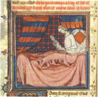 Рождение Каина. Миниатюра, Франция, XIV век.