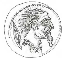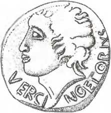 Два портрета Верцингеторикса, один (слева) - реалистичный (монета Гостилия Сазерны, 48 г. до н.э.), другой (справа) - идеализированный (голова Аполлона на арвернском стажере)