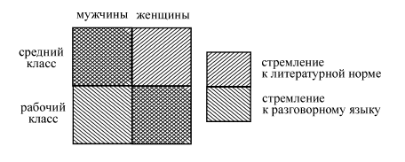 Понятие скрытого престижа возникло, когда лингвисты пытались объяснить постоянство разговорных (нелитературных) форм в речи рабочего класса. Ввиду противодействия рабочего класса литературному английскому языку (представители этой социальной группы желали говорить так, как они говорят) мы вынуждены допустить существование еще одной разновидности языковой нормы – разговорной, просторечной, обладающей скрытым престижем и оказывающей сильное влияние на языковое поведение. В свете тестов на самооценку Траджилла и примеров различий между мужчинами и женщинами, представленных в предыдущей главе, резонно предположить, что разговорные формы обладают скрытым престижем не только среди рабочего класса, но также и среди мужчин. Недооценка характерна в равной степени, как для мужчин среднего класса, так и для рабочего класса Норвича. Напрашивается вывод, что мужчины Норвича действительно стремятся к употреблению не соответствующей установленным нормам речи рабочего класса.