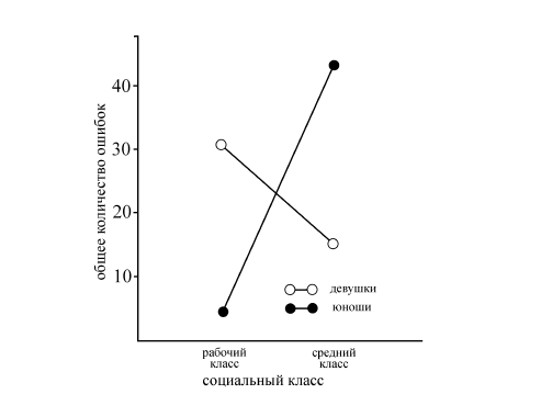 Диаграмма 4.13. Взаимовлияние пола и социальной группы детей на основе ошибок в идентификации пола [Edwards 1979, 93].