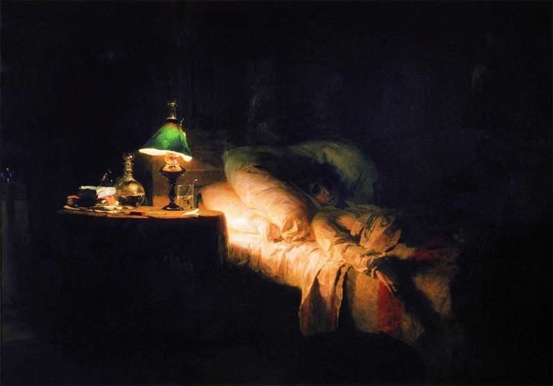 Глубокая ночь. Едва видимая в темноте, лежит на темной постели больная, умирающая девушка-подросток.