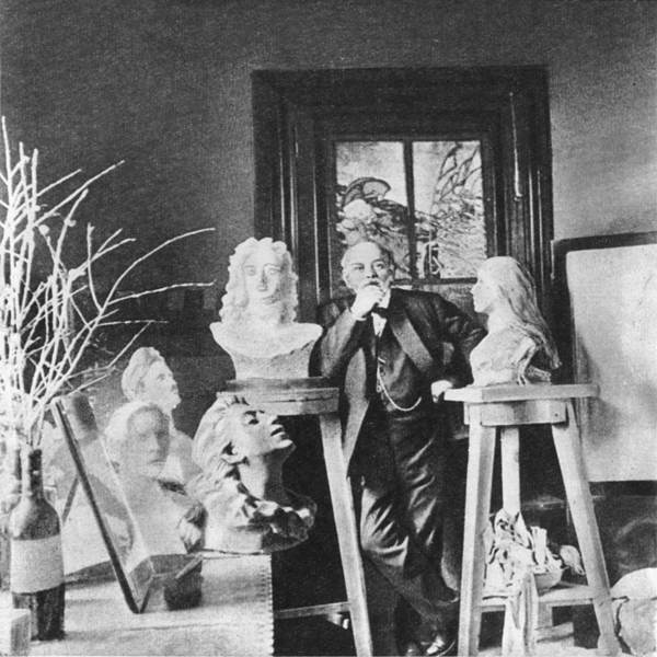 Савва Иванович Мамонтов среди созданных им скульптур. Фотография. «Завидно талантливым» называл его Горький за то, что своим энтузиазмом, своей поистине неуемной страстью к театру, к музыке, к живописи он воодушевлял других.