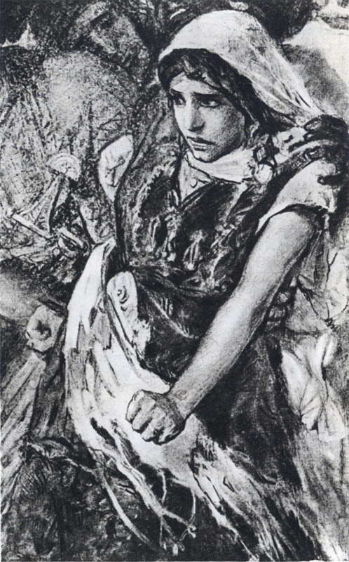 Чтобы подчеркнуть отчаянное положение девушки, художник дал всю картину в непривычных для него темных тонах…