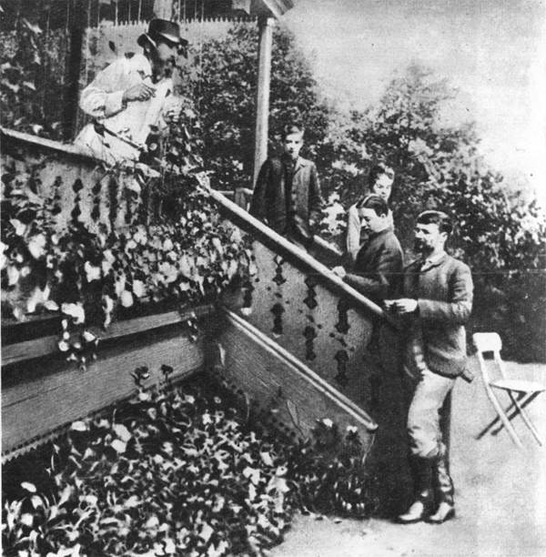 Лето 1888 года Поленовы опять проводили в Жуковке; талантливая молодежь окружала их. Справа налево: Костенька Коровин, Наташа Поленова, Маша Якунчикова, Сережа Спиро и его отец Петр Антонович Спиро — большой друг Василия Дмитриевича. Фотография.