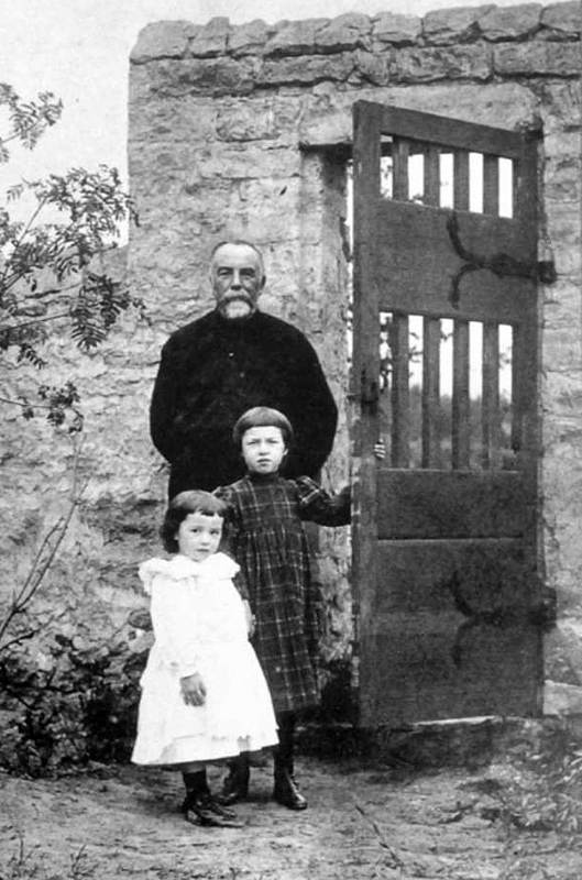 Василий Дмитриевич с младшими дочерьми, Ольгой и Наташей, у входа в усадьбу Борок. Фотография.