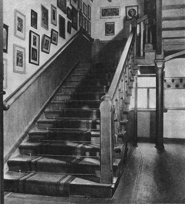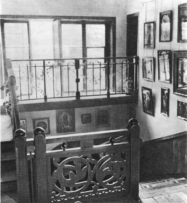 Первое, что видит посетитель, — это дубовая лестница на второй этаж. По стенам развешаны репродукции с произведений старых западноевропейских мастеров, которых особенно любил Поленов. Современная фотография.