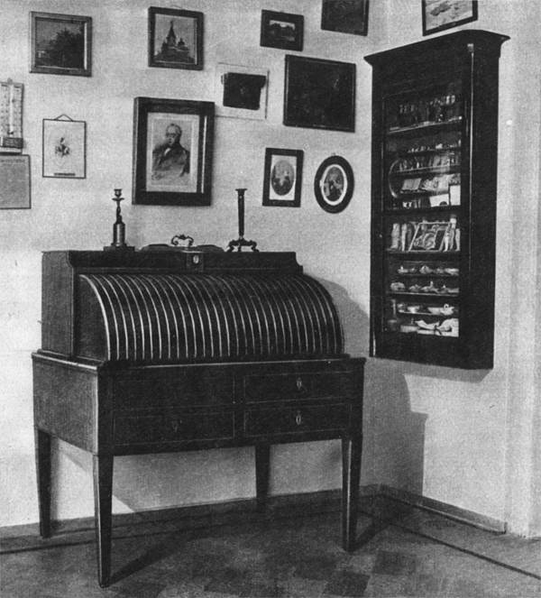 В портретной справа от входа — бюро красного дерева, за которым прадед Василия Дмитриевича — Алексей Яковлевич Поленов писал свой труд об освобождении крестьян. В настенном шкафу — коллекция египетских и древнегреческих находок Василия Дмитриевича и его отца. Современная фотография.