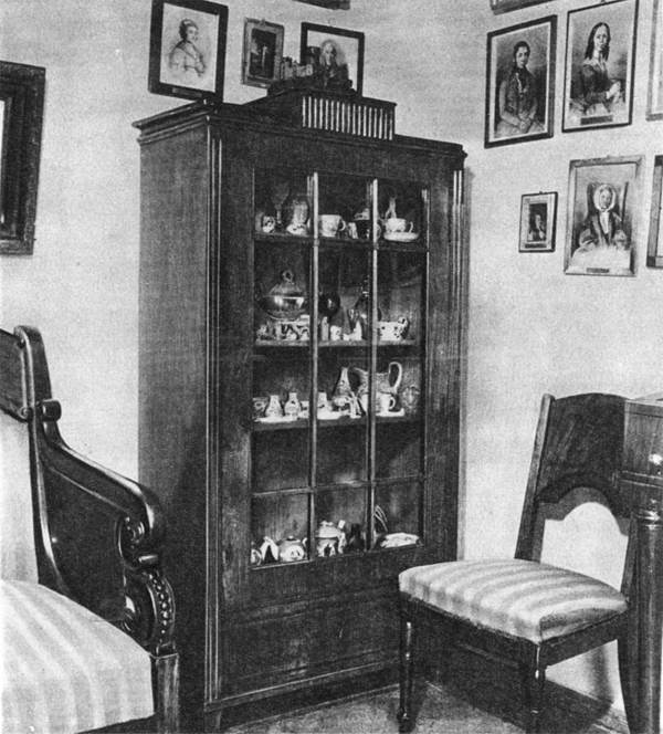 Другой угол портретной. В шкафу, некогда принадлежавшем Державину, хранятся старинный фарфор и хрусталь. Современная фотография.