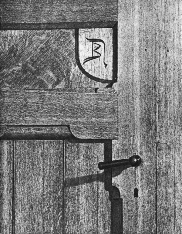 Деталь дубовой двери библиотеки, изготовленной по рисунку Василия Дмитриевича с его монограммой — соединенными вместе буквами «ВП». Фотография.