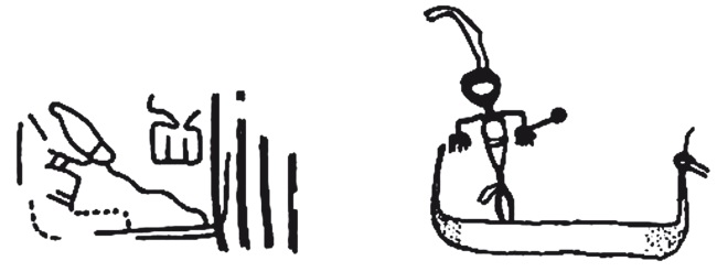 Рис. 29. Лодки в резьбе протодинастической (?) каменной курильницы из Кустула и в доисторической петроглифике Восточной пустыни (Вади Абу-Васил)