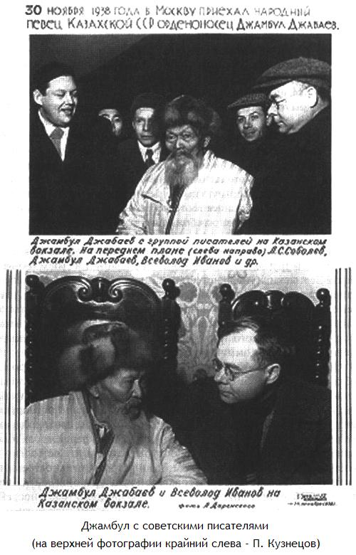 На фоне многочисленных народных певцов и сказителей, публиковавшихся во второй половине 1930-х годов в центральной и областной печати, выбор, павший на Джамбула, представляется в общем достаточно случайным. «Открытие» творчества казахского акына для советского читателя связывается с именем Павла Кузнецова, опубликовавшего в 1936 году первые переводы песен Джамбула. Но Джамбул не был единственным открытием Кузнецова. За два года до появления в газете «Правда» публикации песни Джамбула «Моя родина» в Алма-Ате в переводе Кузнецова был издан сборник произведений еще одного казахского аэда, по имени Маимбет. Тематически и стилистически песни Маимбета, славившего Сталина и клявшего «врагов народа», вполне схожи с песнями Джамбула в последующих переводах того же Кузнецова или Алтайского[395]. Однако в 1938 году цитаты из произведений Маимбета, как и упоминания его имени, из печати исчезают и больше нигде — ни в историко-научных трудах, ни в сборниках казахского фольклора и литературы — не фигурируют. Объяснение этому исчезновению дал литературовед и переводчик А. Л. Жовтис, долгие годы работавший в вузах Алма-Аты и хорошо знавший литературное окружение Кузнецова и Алтайского. По утверждению Жовтиса, от имени Маимбета писал не кто иной, как сам Кузнецов, самого же акына с таким именем никогда не существовало. Мистификация стала рискованной, когда Маимбет удостоился заочного внимания властей, после чего искомый акын нежданно-негаданно исчез, «откочевав», по покаянному объяснению Кузнецова, с родственниками в Китай[396]. Последним упоминанием о Маимбете стала юбилейная статья А. Владина «Джамбул и его поэзия (к 75-летию творческой деятельности)», напечатанная в майском номере «Нового мира» за 1938 год[397].