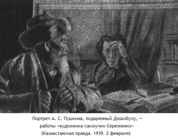 Затем народному певцу преподнесли еще один подарок. Это был большой портрет Пушкина. Великий казахский поэт долго смотрел на изображение гениального русского поэта, который более ста лет назад, но совсем незадолго до рождения Джамбула, пророчески предсказал свою будущую славу среди народов России. Этот момент был как бы кульминацией вечера, и долго не умолкавшие аплодисменты показали, что всем понятен глубокий смысл этой встречи Джамбула с Пушкиным, встречи величайшего гения русской поэзии с прославленным казахским певцом[440].