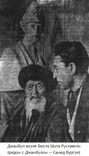 Публикуемые в газетах фотографические снимки казахского акына у бюста Руставели и возле подаренного ему портрета Пушкина свидетельствуют о той же органической связи, обнаруживающей «глубокий смысл» без лишних объяснений: