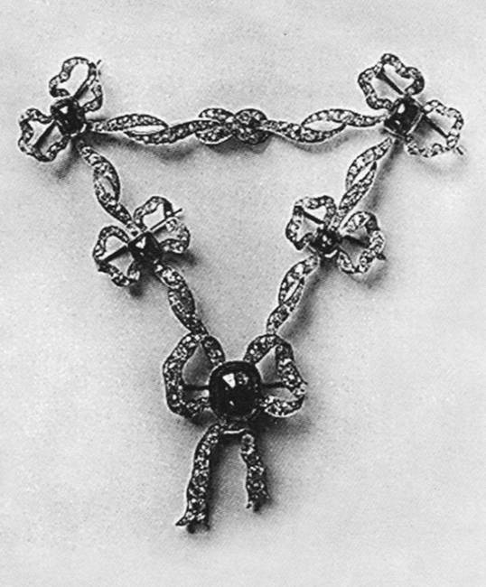 Около 1897 года, выполняя заказ молодой императрицы Александры Феодоровны, Болин создал диадему и ожерелье, входившие в великолепную алмазную парюру с крупными изумрудами. Украшение на корсаж, входившее в этот гарнитур, ввиду срочности работы, исполнил Кнут-Оскар Пиль, мастер московского отделения фирмы Фаберже. В ожерелье чередовались алмазные петли и бантики красивого рисунка, дополненные каплевидными подвесками, своеобразной подковкой окружающими изумрудные кабошоны. Те же элементы мастер Роберт Шван (Швеи) использовал и в диадеме, однако теперь исполненные из южноафриканских алмазов ленты, взмывая кверху, то свивались в тяжёлые петли, окружающие фантастический цветок с сердцевинкой из крупного изумруда, то прихотливо сплетались в капризно изогнутые банты. Мало того, что громадный травянисто-зелёный изумруд в центре диадемы весил 23 карата, но сей смарагд, найденный в копях Колумбии, для большего эффекта огранён высоким четырёхугольным пирамидальным кабошоном.[350] Дивная диадема настолько нравилась коронованной владелице, что художник Николай Корнилиевич Бодаревский запечатлел её на одном из портретов супруги Николая II.[351] Поскольку в это время не редкостью стали трансформирующиеся украшения, Роберт Шван сделал отдельные детали диадемы съёмными, отчего понадобилось их пронумеровать (см. рис. 16, 17 вклейки).