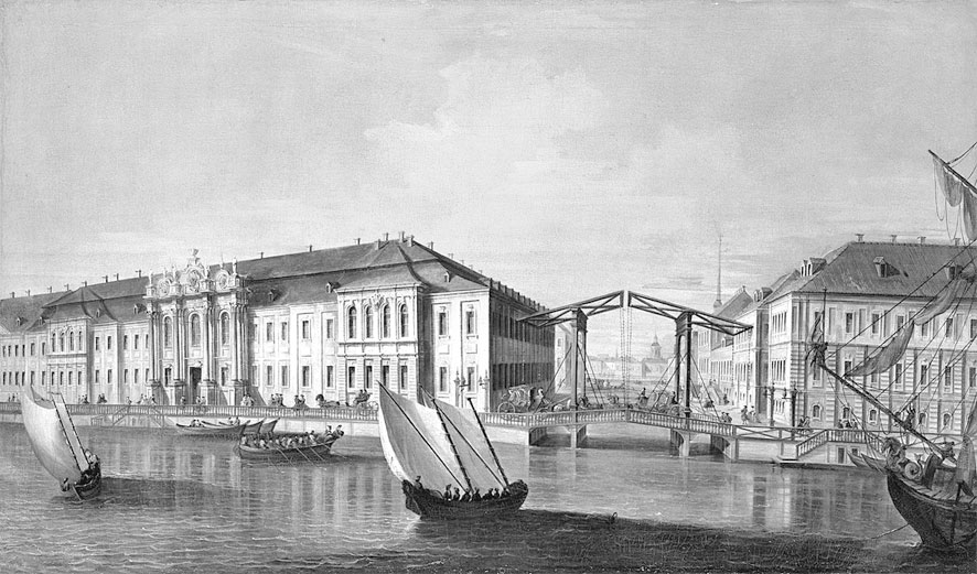 Вид Зимнего дворца. В прошлом главный императорский дворец России. Дворец построен в 1754–1762 гг. итальянским архитектором Б. Ф. Растрелли в стиле пышного елизаветинского барокко с элементами французского рококо в интерьерах. Начиная с советского времени в стенах дворца размещена основная экспозиция Государственного Эрмитажа. Неизвестный итальянский художник, по рисунку М. И. Махаева, конец 1750 г.