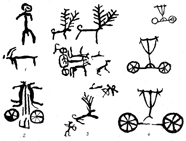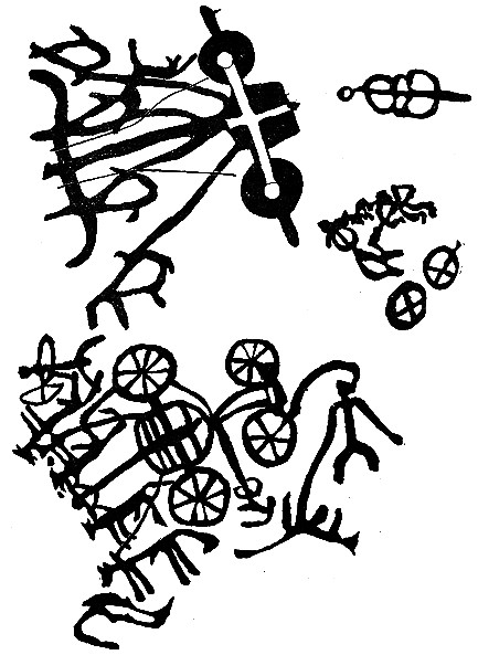 Самым интересным среди петроглифов можно, без сомнения, считать изображение четырехколесной колесницы (или, возможно, двух двухколесных колесниц). А.П. Окладников описал эту колесницу как солнечную, поскольку, по его мнению, ее кузов имеет вид солнца (в действительности кузов вряд ли можно сравнивать с солнцем, он даже не круглой, а овальной формы). Он же датировал рисунок VII—V вв. до н.э., ибо ошибочно принял изображение возницы за штандарт, аналогичный тем, что известны на скифских повозках [Окладников, 1964, с. 210-211]. Между тем фигура эта чрезвычайно сходна с изображением колесничих на всех описанных выше колесницах (например, из Яманы-уса). В настоящее время, после открытия целого ряда рисунков колесниц с точно такими же возницами, не остается сомнений, что фертообразная фигура изображает колесничего, а не штандарт. Следовательно, этот довод, как единственный датирующий все подобные рисунки скифским временем, должен быть ныне отвергнут.