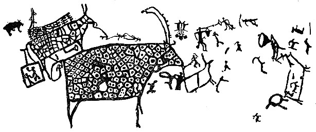 В результате двукратного использования одной поверхности более древний рисунок несколько пострадал, хотя художник, работавший позднее, был достаточно деликатен. Во всяком случае, мы видим полностью и две колесницы со всеми мелкими деталями, в: впряженных в них коней.
