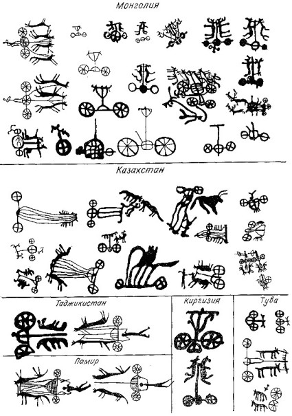 В монгольских петроглифах наблюдается четкая закономерность: с одной стороны, колесниц еще нет среди энеолитических образов (масок, антропоморфных фигур, быков в статичных позах, показанных сплошным силуэтом), с другой — колесницы сопровождаются повсюду воинами и пешими охотниками с боевыми топорами за поясом, оленями с вертикальными стволами рогов.