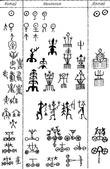 Рис. 25. Сравнительная таблица пиктограмм Китая с петроглифами Монголии и Алтая (76/77)