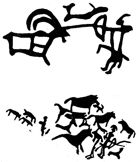 Алтайские изображения особенно интересны благодаря тому, что колесницы в долине р. Елангаш являются частью больших сложных сюжетов, а это облегчает датирование серии рисунков животных и трактовку роли самих колесниц [Окладников и др., 1979]. Так же как на Чулууте в Монголии, колесницам Алтая сопутствуют олени с вертикальными стволами рогов в форме елочек, быки, рога которых имеют лунообразную или лировидную форму, солнцерогие олени. Эта серия рисунков еще раз подтверждает справедливость выделения мною комплексов изображений эпохи колесниц.