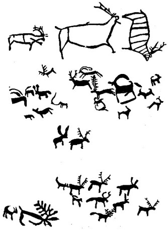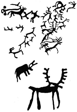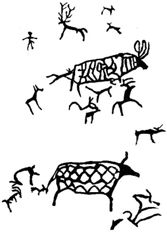 Сначала лоси, олени, быки показаны идущими или стоящими, с расчлененными телами. Затем на смену единичным фигурам приходит изображение сцен охоты, но не обычной, а мифической: огромные олени и быки преследуемы десятками собак и окружены мелкими фигурами оленей, быков и т.д. На этом этапе изобразительного искусства (развитой бронзовый век, середина II тысячелетия до н.э.) олени часто переданы на длинных (84/85) вытянутых ногах (как бы в позе жертвенных животных), иногда уже с птичьими клювами, но всегда с вертикальными рогами. Тот же образ фантастического зверя с птичьим клювом, а иногда с птичьими лапами сохраняется и позднее. В начале I тысячелетия до н.э. этот образ трансформируется следующим образом: олень имеет неестественно длинное тело, заполненное десятками квадратов (позднее сохраняется лишь деление на основные части), длинные вытянутые ноги и, что особенно интересно, ветвистые рога, простертые вдоль всего тела. Ветвистые рога, клювообразная морда, горб на преувеличенно вытянутом теле — все это выдает то новое, что станет каноном в искусстве скифского времени в середине I тысячелетия до н.э.