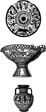 Для изучения греческой одежды и утвари особенно важны (кроме уцелевших скульптурных произведений) расписанные сосуды (рис. 11), найденные в Греции и ее бывших колониях. Так как эти сосуды относятся к продолжительному периоду времени с VI в. до н. э. до падения Греции, то по ним мы можем проследить как развитие самого ремесла в Греции, так и (по рисункам, на них сделанным) все изменения, которые испытывала греческая одежда и утварь в течение этого времени.
