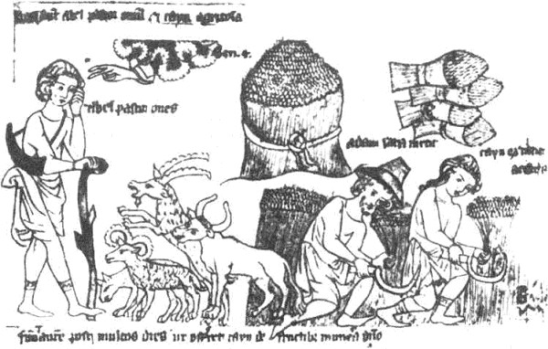 Адам и его сыновья. В роли жнецов выступают первый человек Адам и его сын Каин (слева стоит пастух — второй сын Адама Авель). Раскрашенный инициал из сборника духовных песнопений. Словакия, 1692 г.
