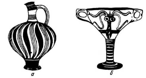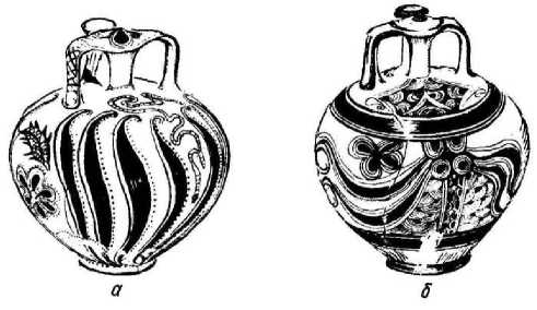 Рисунок 10. Элладский сосуд (а) и критский сосуд дворцового стиля (б) второй половины XV в. до н. э. (ПЭII и ПМII)