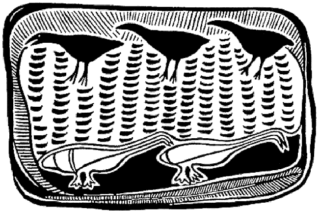Как известно, в Австралии водятся черные лебеди; их происхождение описано в сказке, которая так и называется «Черные лебеди». Варрунга — даян, который был колдуном, зачем-то превратил двух своих братьев в белых лебедей (нам нет надобности вникать в причины этого поступка). Лебеди летали за братом, а потом сели отдохнуть. В это время мимо летели соколы, посланцы духов, чтобы передать послание. Но, увидев в своей лагуне двух странных птиц, они ринулись вниз и вонзили в несчастных лебедей свои огромные когти и острые клювы. Схватив их, они полетели дальше, выдирая из лебедей их белые перья. Когда соколы выщипали последние перья, они вспомнили, что не передали кому следует послание духов, и бросили лебедей. Бедные лебеди, замерзшие без перьев и истекающие кровью, чувствовали, что погибают. Но тут прилетели горные вороны, которые считали соколов своими врагами, и стали сыпать на лебедей, чтобы согреть их, свои черные перья (рис. 20). Черные перья покрыли лебедей, только немного перьев на крыльях да пух под перьями остались белыми. А красная кровь навсегда окрасила их клювы. Выщипанные соколами белые перья лебедей пустили корни там, где они упали, и из них выросли белые цветы (МСА1965).