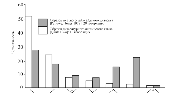 Диаграмма 7.2. Приблизительное процентное распределение тонов для двух информантов – носителя тайнсайдского и литературного английского языка [Local 1982, 89].