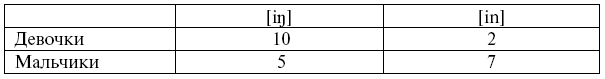Эти различия статистически значимы. Вероятно, дети усвоили, что в их речевом сообществе [??] – маркер женской речи и [in] – маркер мужской речи.