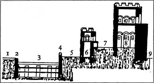 Разрез городской стены со стороны суши 1. Внешний уровень. 2. Контрэскарп с акведуком. 3. Ров с плотиной (diataphrismata). 4. Зубчатая стена эскарпа. 5. Вторая ограда внутреннего двора. 6. Вторая ограда, построенная в 447 году, с казематами и башенками. 7. Ложный нижний вал - фоссебрея, или первая ограда внутреннего двора. 8. Первая ограда, построенная в 413 году с большими башнями и лестницей. 9. Уровень улицы внутри стен с водопроводом питьевой воды