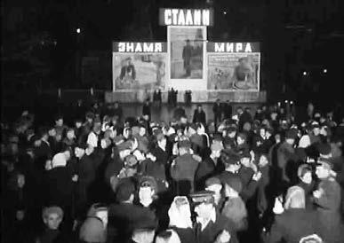 И все же самыми выразительными оказались кадры, снятые на Центральной площади Минска в ночь с 6 на 7 марта 1953 года. Конечно, рембрандтовский светотеневой рисунок при проведении кинохроникальных съемок используется довольно редко. На траурной церемонии в Минске такое изобразительное решение возникло спонтанно, как следствие вынужденных обстоятельств – только так можно было обеспечить приемлемые технические (главным образом – экспозиционные) условия для съемки. И, как нередко бывает во всех видах художественного творчества, именно эта случайность создала особую эстетику изображения, подчеркнула атмосферу народной скорби и исторический характер происходящего.