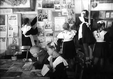 До лета 1954 года в школе практиковалось раздельное обучение мальчиков и девочек, однако на большинстве хроникальных кадров, запечатлевших организацию ученической выставки и работу школьной библиотеки, основной девичий контингент был пополнен тремя-четырьмя мальчиками 11–12 лет, которые выглядят значительно младше своих сверстниц.