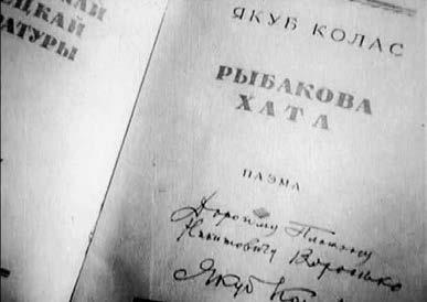 Второй эпизод – экспозиция книг белорусских писателей как зримый итог их работы. Никакая случайность не в силах нарушить выверенную иерархию представления: вначале – книги на белорусском языке, затем – на русском, потом – на украинском и лишь в конце списка – на польском (Я. Купала «Над рекой Орессой»), чешском и китайском языках (о двух последних говорит лишь диктор, самих книг в кадре нет).