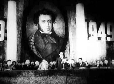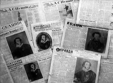 Вероятно, режиссер киноочерка «150 лет со дня рождения А. С. Пушкина» Лев Голуб, создавая этот юбилейный материал для киножурнала «Советская Беларусь» (1949, № 16), стремился решить триединую задачу.