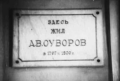 Кадры юбилейного хроникального сюжета запечатлели торжественное открытие памятника Суворову – бронзового бюста работы итальянского скульптора Пьетро Кюфферле, установленного перед входом в музей. Оригинал бюста был создан еще в 1901 году, а бронзовая копия отлита в Ленинграде в 1947 году с гипсового оригинала.
