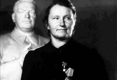 Характер портретируемой героини вполне соответствует тематике выставки – скульптор заканчивает работу над бюстом Героя Социалистического Труда Ефросиньи Павловны Лесничей, звеньевой группы льноводов колхоза «Профинтерн» Верхнедвинского района Витебской области.