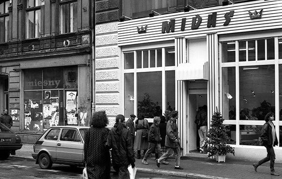 Во всех таких киосках и предприятиях общепита непременные занавески на окнах. В гигиеническом отношении это рискованно, но полякам нравится: ведь занавески вешали для украшения окошек даже в «сиренках». Есть магазины, витрины которых затянуты драпировками, там стоят страшенные манекены с голубоватой кожей, постепенно теряющие носы и пальцы (здесь мой собеседник напоминает мне обычай, который в Польше исчез, как мне кажется, совершенно: получение квитанции у продавщицы, поход к кассе и возвращение за купленным товаром с чеком), но есть и блистающий новизной Midas на Петроковской.