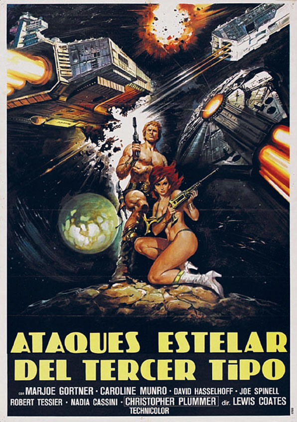 Из всех фильмов, воровавших у «Звездных войн», итальянский культовый фильм «Столкновение звезд» – вы видите его испанский постер – делал это наиболее откровенно. В фильме были битва на световых мечах и уничтожающее планету сверхоружие; на постере можно увидеть что-то похожее на Звездный разрушитель и «Тысячелетний сокол». Название переводится как «Звездные столкновения третьей степени».