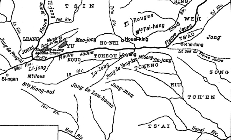 2.?Страны центра. Согласно традиции, для установления своей власти цари дома Чжоу опирались на варваров ди, с которыми их предки якобы жили вместе. Еще она настаивает на том, что будто бы люди Инь попытались вернуть престол при содействии варваров, живших в Хуай. В «Книге песен» («Ши цзин») воспеваются подвиги царя Сюаня (827–782) в борьбе с варварами из Хуай. Как говорят, Чжоу покинули Шэньси (в районе Сиань) при царе Пине (770–720) под давлением ди, чтобы осесть дальше к востоку, на берегах Ло, в Хэнани. Ло протекает в замкнутой долине, в самом сердце китайской страны. Однако же в своей новой резиденции цари Чжоу отнюдь не были в безопасности от набегов варваров. В 613 г. женившийся на царевне из племени ди царь Сян был изгнан теми же ди из собственной столицы.
