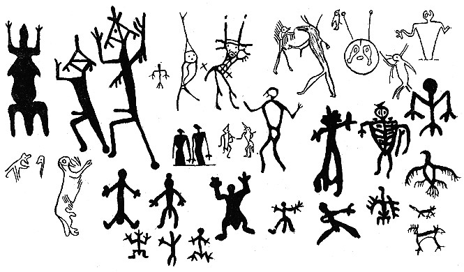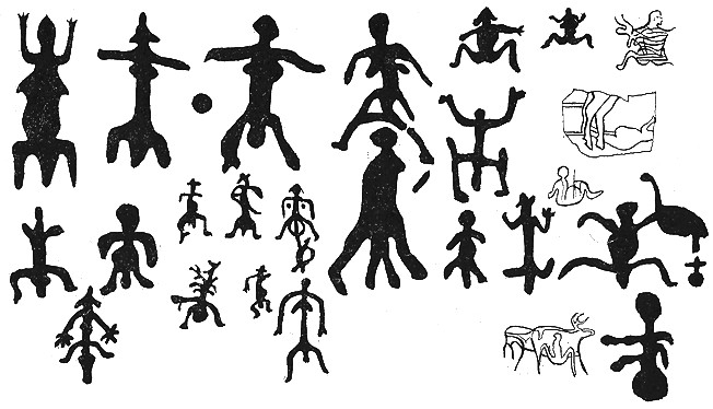 Принципиальной разницы между всеми перечисленными группами изображений нет. Одни фигуры более схематичны, другие менее, но все изображают персонаж женского рода, все (или почти все) имеют трехпалые руки, подобные птичьим лапам. Головной убор и рукава некоторых фигур украшены лоскутками, подобно шаманским костюмам сибирских и монгольских народов. Возможно, показаны матери-предки, возможно — шаманки, замаскированные под птицу. Напомним, что у нивхов одно и то же слово обозначает понятия «шаман» и «орел», а у бурят орел-шаман является посланцем небесных божеств в помощь людям. Известно, что древнейшее поверье у многих народов связывает превращение в птицу (или зверя) с обрядом надевания крыльев птицы (или шкуры зверя). Мифологический герой североамериканских индейцев Эмемкут превращается в Великого Ворона при помощи вороньего костюма. Душа у многих древних народов ассоциируется с образом птицы, а смерть — с отлетом души-птицы на небо. Души североамериканских индейцев гуронов — голуби, души алтайцев — петухи (не случайно эти птицы изображены на погребальных сюжетах Пазырыкских курганов), души якутов — жаворонки. Древние египтяне считали, что душа умершего вылетает из тела в виде птицы, народы Средней Азии верили, что душа имеет образ голубя или иной птицы. Но едва ли не самое интересное сравнение мы находим в этнографии народа семангов, которые говорят о беременной женщине, что «она съела птицу». Души предков также живут в птицах, поселяясь в них сразу же после смерти людей.