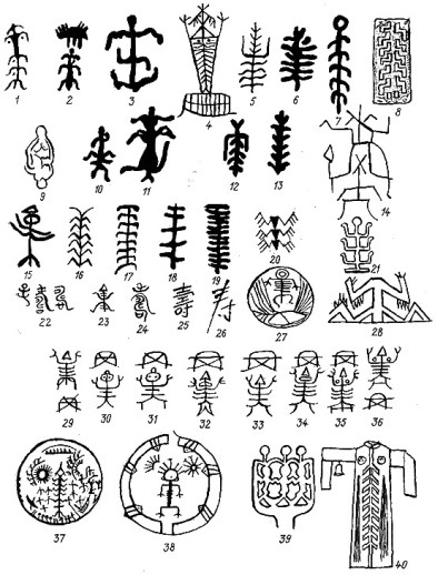 Рис. 13. Изображения матерей-прародительниц от эпохи палеолита до XIX в. (1-8 — Монголия, 9 — Франция, 10-14, 37, 33, 40 — Сибирь, 15-19 — Западная Европа, 20, 22-36, 39 — Китай, 21 — Корея) (45/46)