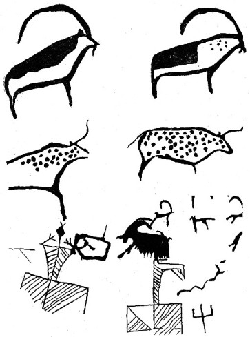 Замена женщины символом — явление не новое. Оно так же типично, как и факт изображения этого сюжета в наиболее скрытом месте. (Вспомним верхнепалеолитические символы, опубликованные Леруа-Гураном [Leroi-Gourhan, 1958].) Наш рисунок отнесен к энеолитическим, так же как и описанные ранее изображения рожениц Чулуута II; к энеолитической эпохе следует отнести и все прочие символические антропоморфные изображения, тем более что они выбиты рядом с масками и быками, имеющими аналогии среди окуневских гравировок и петроглифов энеолитической эпохи [Вадецкая, 1970].